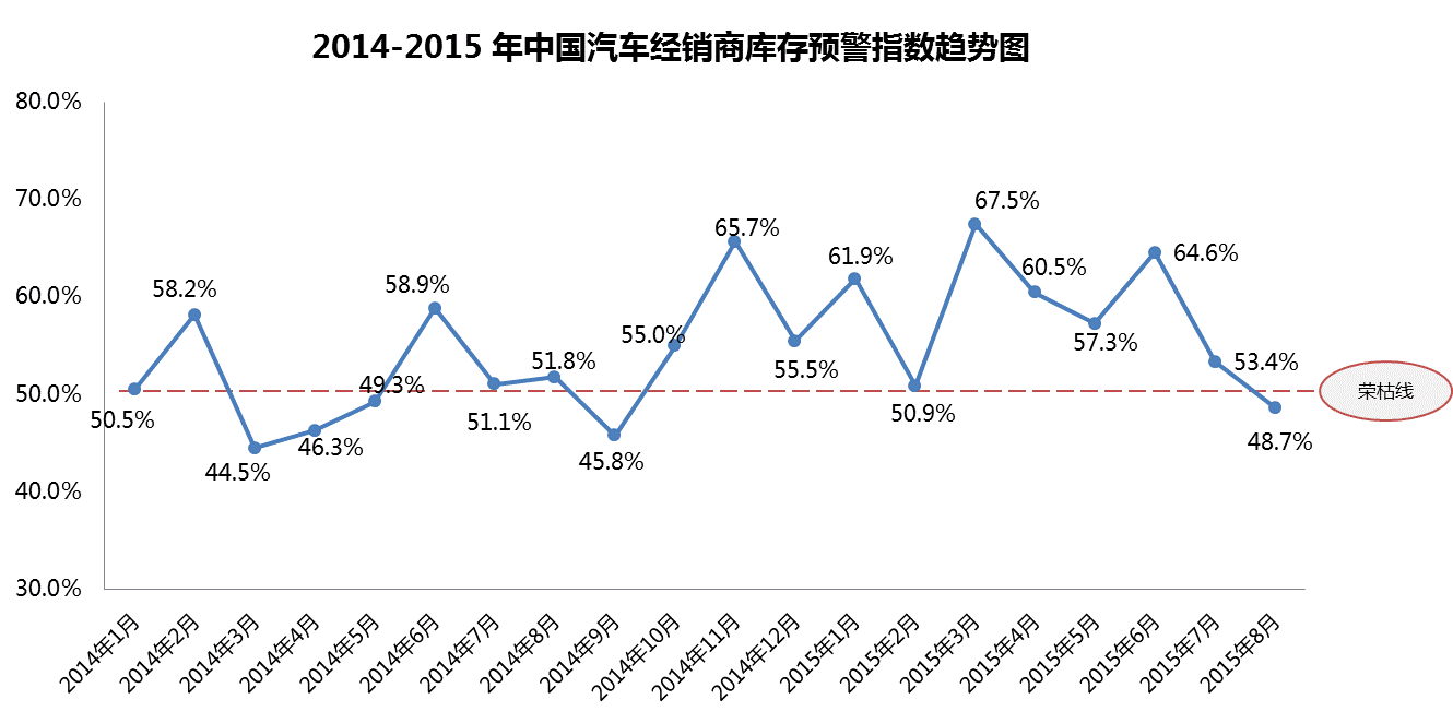 中国汽车流通协会发布的“中国汽车经销商库存预警指数调查”VIA(Vehicle Inventory Alert Index)显示,2015年8月库存预警指数为48.7%,比上月下降了4.7个百分点。库存预警指数连续10个月处在荣枯值之上,8月预警指数回落到警戒线以下,汽车市场出现温和回升迹象。