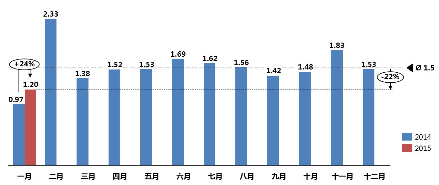 2015年2月20日,中国汽车流通协会对外发布2015年1月份“汽车经销商库存调查结果”。1月份汽车经销商综合库存系数为1.20,环比下降22%,同比上升24%,经销商库存水平处于警戒线水平以下,库存压力缓解(见图1)。