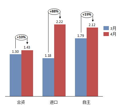 2014年4月份,合资品牌库存系数为1.43,环比上升10%,处于警戒库存水平内;进口品牌库存系数2.22,环比上升88%,上涨幅度较大,库存压力明显增大;自主品牌库存系数为2.12,环比上涨19%,超过警戒库存水平,存在一定压力。4月份整体库存水平有一定上涨,库存总指数略高于合理库存范围,库存压力略有提升。自主、进口品牌库存指数均在2.0以上,虽未超警戒库存水平,但库存压力仍很大。(见图2)