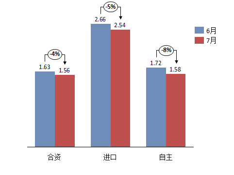 7月份,合资、进口、自主品牌库存系数均有一定幅度下滑,合资品牌库存系数由上月1.63降至1.56;自主品牌库存系数由上月的1.72降至1.58;进口品牌库存系数由上月的2.66降至2.54。本月,合资、自主品牌仍处于警戒线水平以上,进口品牌处于较高库存水平,经销商库存压力与上月相比没有明显改善,部分品牌经销商库存压力继续加大。