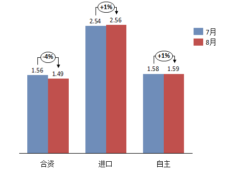 8月份,合资品牌库存系数有一定幅度回落,处于警戒线水平以下,自主品牌和进口品牌的库存系数与上月基本持平。合资品牌库存系数由上月1.56降至1.49;自主品牌库存系数由上月的1.58升至1.59;进口品牌库存系数由上月的2.54升至2.56。本月,自主、进口品牌仍处于警戒线水平以上,其中进口品牌处于较高库存水平,消费者对于进口品牌仍处于观望状态。