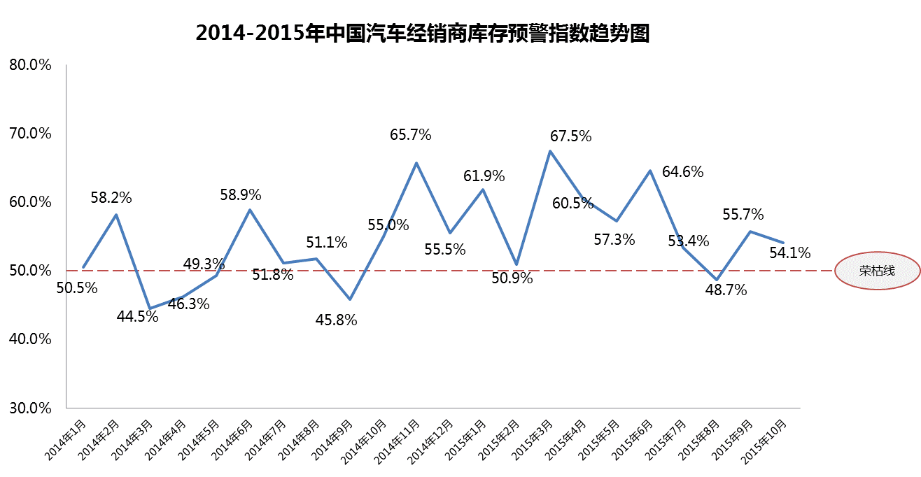 中国汽车流通协会发布的“中国汽车经销商库存预警指数调查”VIA(Vehicle Inventory Alert Index)显示,2015年10月库存预警指数为54.1%,比上月下降了1.6个百分点??獯嬖ぞ甘τ诰湎咭陨?。