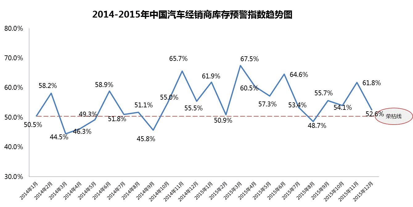 中国汽车流通协会发布的“中国汽车经销商库存预警指数调查”VIA(Vehicle Inventory Alert Index)显示,2015年12月库存预警指数为52.6%,比上月下降了9.2个百分点??獯嬖ぞ甘τ诰湎咭陨稀?