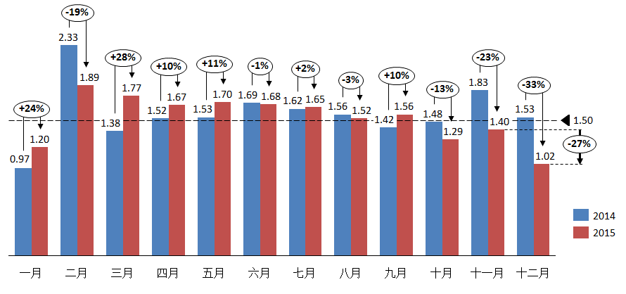2016120日,中国汽车流通协会对外发布201512月份汽车经销商库存调查结果12月份汽车经销商综合库存系数为1.02,环比下降27%,同比下降33%,经销商库存水平依然处于警戒线以下,相比上月,经销商库存压力明显减?。?/span>1)。