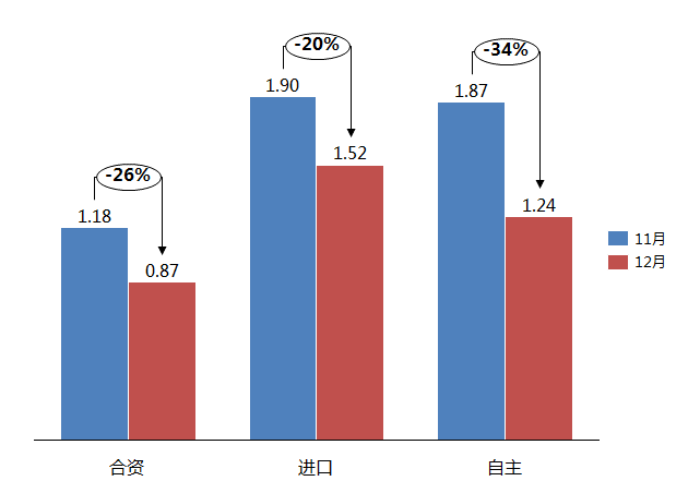 12月份,合资、进口、自主品牌库存系数均有下降,合资品牌库存系数由上月1.18降至0.87,环比下降26%;进口品牌的库存系数由上月的1.90降至1.52,环比下降20%;自主品牌库存系数由上月的1.871.24,环比下降34%;合资、进口、自主品牌经销商的库存压力均有不同程度的减小。