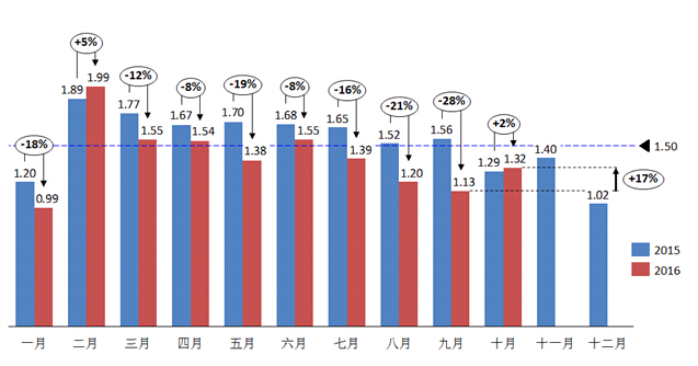2016年11月18日,中国汽车流通协会对外发布2016年10月份“汽车经销商库存调查结果”。10月份汽车经销商综合库存系数为1.32,环比上升17%,同比上升2%,经销商库存水平位于警戒线以下(见图1)。