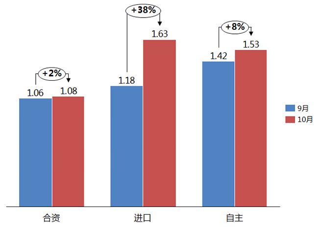 10月份,合资品牌、进口品牌和自主品牌库存系数相比上月均有所上升,合资品牌库存水平位于警戒线以下,进口品牌和自主品牌库存水平位于警戒线以上。合资品牌库存系数为1.08,环比上升2%。进口品牌库存系数为1.63,环比上升38%。自主品牌库存系数为1.53,环比上升8%。