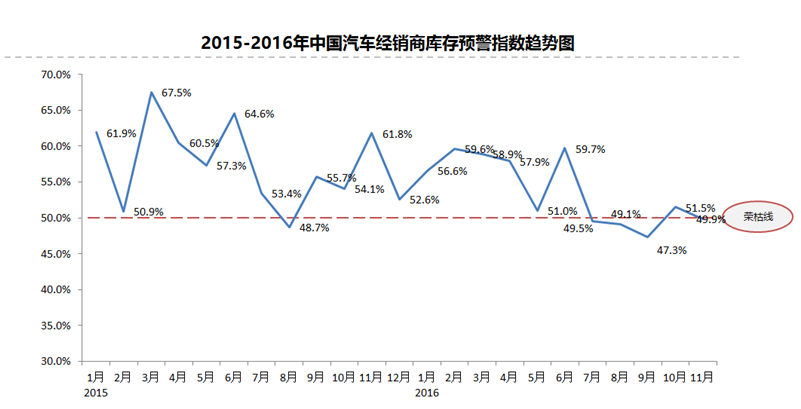 2016年11月份中国汽车经销商库存预警指数为49.9%