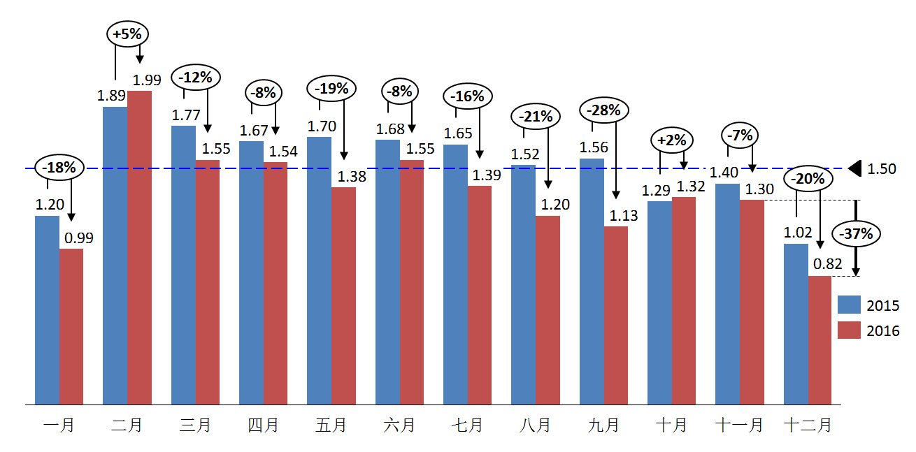 2016年12月份经销商库存系数为0.82