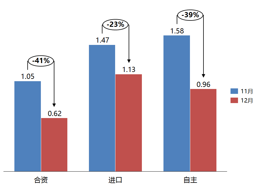 12月份,合资品牌、进口品牌和自主品牌的库存系数相比上月均有所下降。合资品牌库存系数为0.62,环比下降41%,合资品牌库存系数已位于0.8~1.2的合理区之下,建议经销商可以合理补充库存,避免因库存过低导致消费者不能及时提车;进口品牌库存系数为1.13,环比下降23%,进口品牌经销商库存水平回落至合理区间;自主品牌库存系数为0.96,环比下降39%,自主品牌经销商库存水平回落至合理区间。