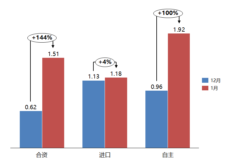 1月份,合资品牌、进口品牌和自主品牌的库存系数相比上月均有所上升。合资品牌库存系数为1.51,环比上升144%;进口品牌库存系数为1.18,环比上升4%;自主品牌库存系数为1.92,环比上升100%。1月,合资品牌和自主品牌均位于警戒线以上。
