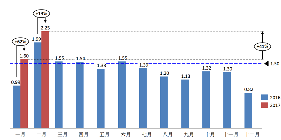 2017年2月份经销商库存系数为2.25