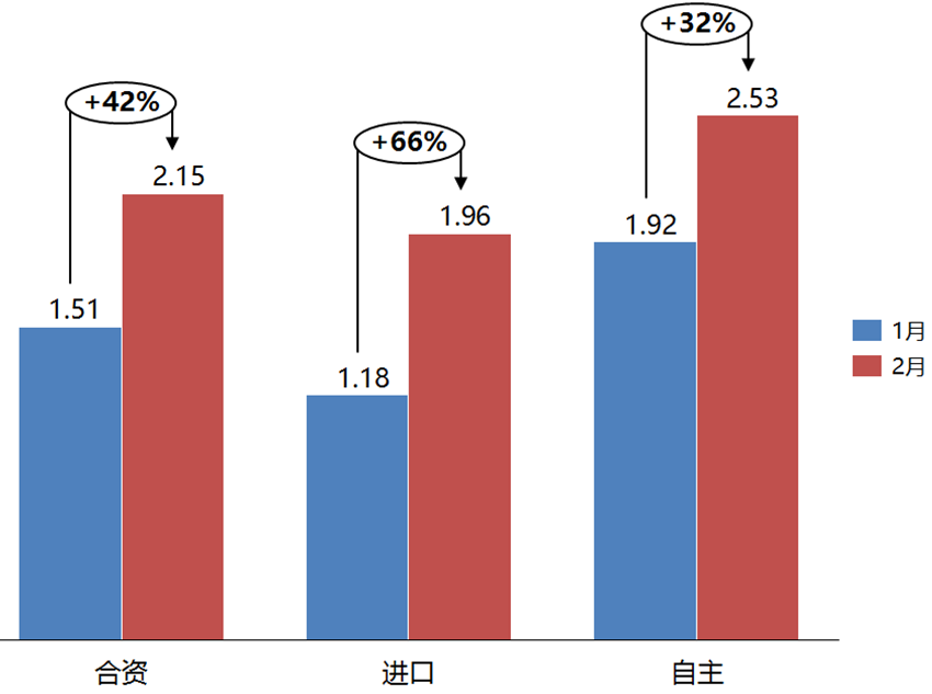 2月份,合资品牌、进口品牌和自主品牌的库存系数相比上月均有所上升。合资品牌库存系数为2.15,环比上升42%;进口品牌库存系数为1.96,环比上升66%;自主品牌库存系数为2.53,环比上升32%。2月,合资品牌、进口品牌和自主品牌库存水平均位于警戒线以上。