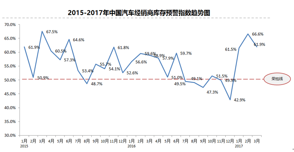 中国汽车流通协会发布的“中国汽车经销商库存预警指数调查”VIA(Vehicle Inventory Alert Index)显示,2017年3月库存预警指数为61.9%,比上月下降4.7个百分点??獯嬖ぞ甘挥诰湎咭陨?。