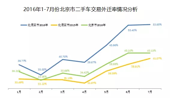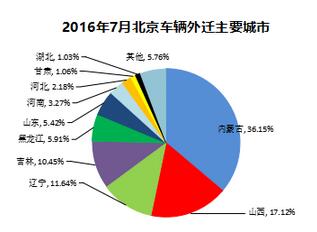 近日,编辑从北辰亚市月度信息会中了解到,2016年1-7月北京市二手车外迁率同比增长19.47%,其中7月二手车外迁率达43.13%。在京城二手车几大主要迁入地中,刚刚解禁的内蒙古、山西、辽宁等省上涨明显,迁入总量占比超过60%。