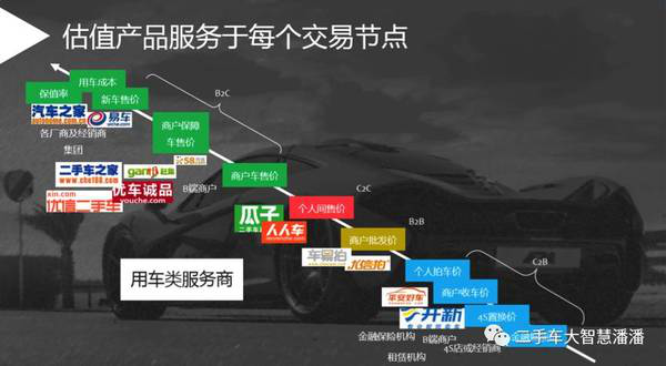 13年的时候,笔者在知乎上写过一篇文章,大概阐述了二手车行业价值链中所产生的服务价值点,每个价值链的节点都是交易,那么估值的产品服务应该是所有交易的节点。