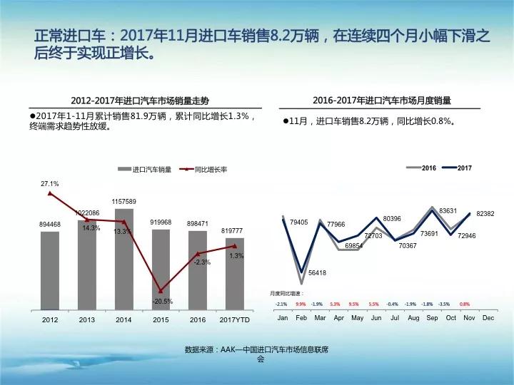 导读:2017年1-11月累计进口110.2万辆,累计同比增长18.2%,进口量持续稳健增长。2017年1-11月累计销售81.9万辆,累计同比增长1.3%,终端需求趋势性放缓。