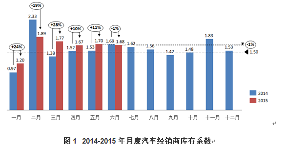 2015720日,中国汽车流通协会对外发布20156月份汽车经销商库存调查结果6月份汽车经销商综合库存系数为1.68,环比下降1%,同比下降1%,经销商库存水平处于警戒线水平以上,库存压力依然较大(见图1)。