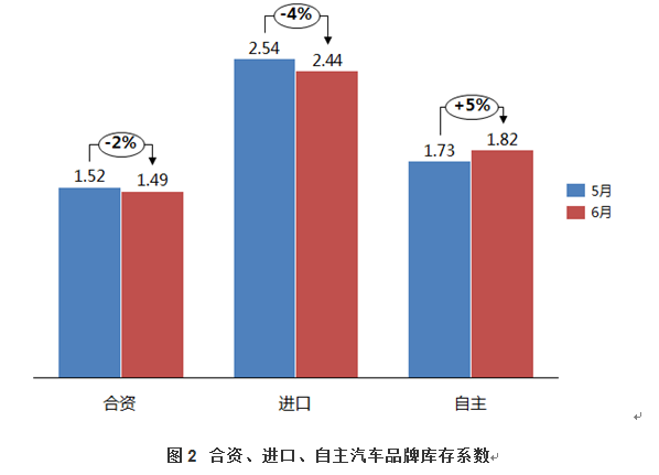 6月份,合资、进口品牌库存系数均有下降,合资品牌库存系数由上月1.52降至1.49,环比下降2%;进口品牌的库存系数由上月的2.54降至2.44,环比下降4%;自主品牌库存系数由上月的1.73升至1.82,环比上升5%;合资、进口品牌经销商在通过降价稳定销量,但市场需求不旺,消费者购车热情和资金能力下降,销量情况并不乐观,厂家和经销商积极控制库存,提车量下降,在一定程度上缓解库存压力。