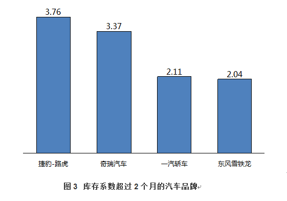 调查显示,6月份,有四个品牌库存系数超过2个月。其中进口品牌为捷豹路虎,合资品牌为东风雪铁龙,自主品牌为奇瑞汽车和一汽轿车。