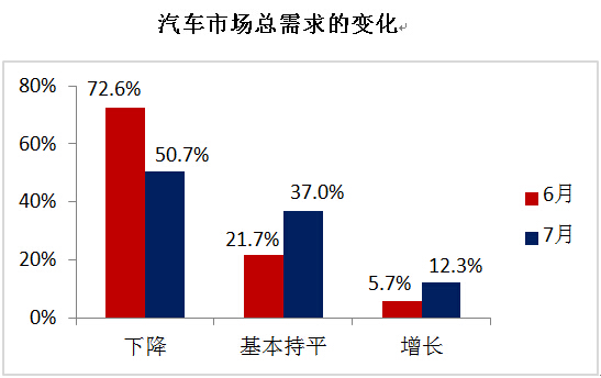 调查显示,7月份市场总需求上升,平均日销量有所增加,从业人员略有增加,经销商经营状况相比上月略好。6月份,汽车市场处于淡季,经济下滑、天气炎热导致需求不旺,消费者购车意愿不强,经销商集客量及成交率不高,导致汽车流通行业景气度降低。但7月份,需求略有回升。部分厂家商务政策不明朗的情况下,经销商提车量下降,库存压力有所缓解。