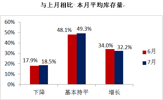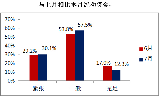 7月份,经销商流动资金状况一般。认为流动资金“一般”的企业从53.8%升至57.5%;流动资金“充足”的比例从上月的17.0%降至12.3%;经营状况“紧张”的比例从上月的29.2%升至30.1%。