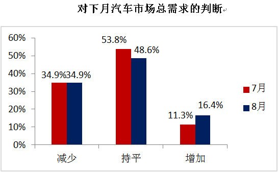 8月份,市场总需求相比上月略有上升。认为市场需求“增加”的经销商比例由11.3%升至16.4%;认为市场需求“下降”的比例与上月持平;认为基本持平的比例由53.8%降至48.6%。