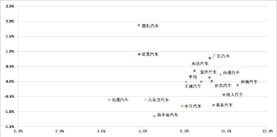 8部分上市经销商2015年汽车销售毛利率(X轴)及变化(Y轴)