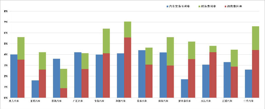 汽车市场整体形势并不乐观,加上愈加激烈的市场竞争,随之而来的是高企的市场推广、销售费用与财务费用,使新车销售的真实利润率(新车销售毛利率-销售费用率-财务费用率)进一步降低。