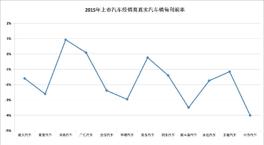 2015年,统计范围内的上市汽车经销商集团真实汽车销售利润率平均为-1.71%,仅国机汽车与广汇汽车真实销售利润率为正值,其他企业的新车销售业务扣除成本和费用后未能实现盈利。