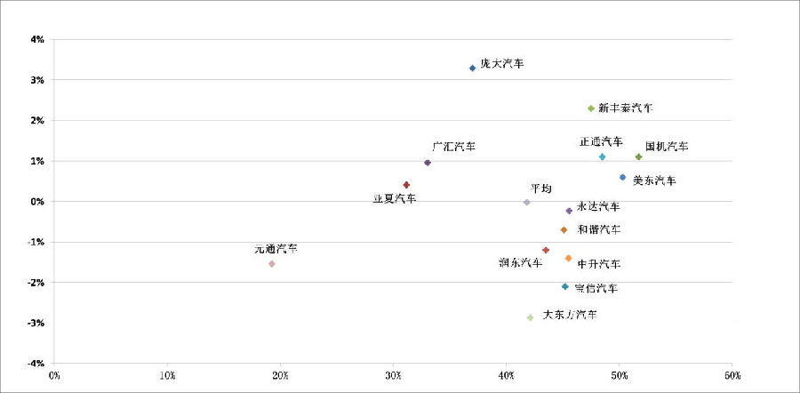 4部分上市经销商2015年毛利率(X轴)及变化(Y轴)