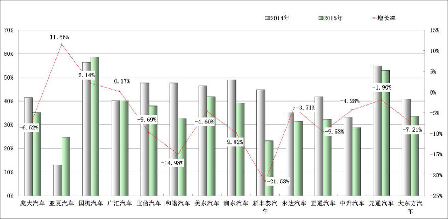 15部分上市经销商2015年汽车销售业务毛利贡献度及变化率