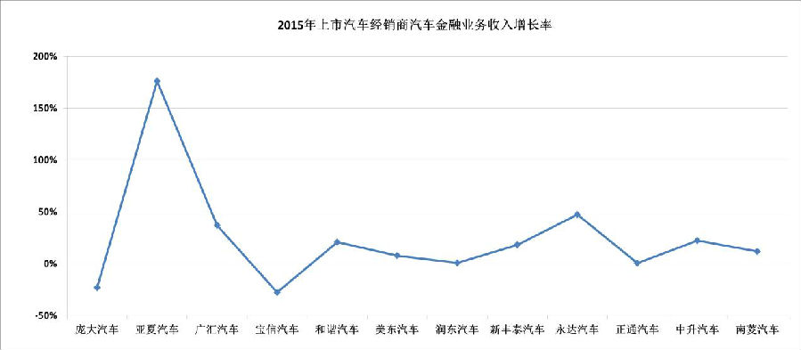 作为汽车售后服务市场的重要组成部分,汽车金融业务已成为汽车经销商的一项重要收入和利润来源。2015年,统计范围内12家汽车经销商集团共实现汽车金融业务收入60亿元,同比上年增长3.31%,其中亚夏汽车、永达汽车、广汇汽车、中升汽车与和谐汽车增长较快,均超过20%。