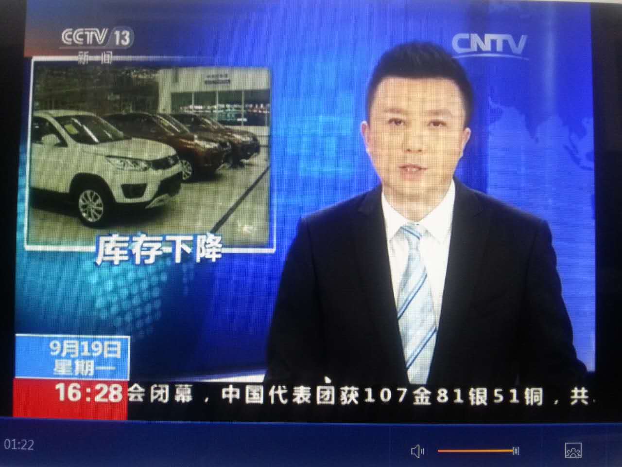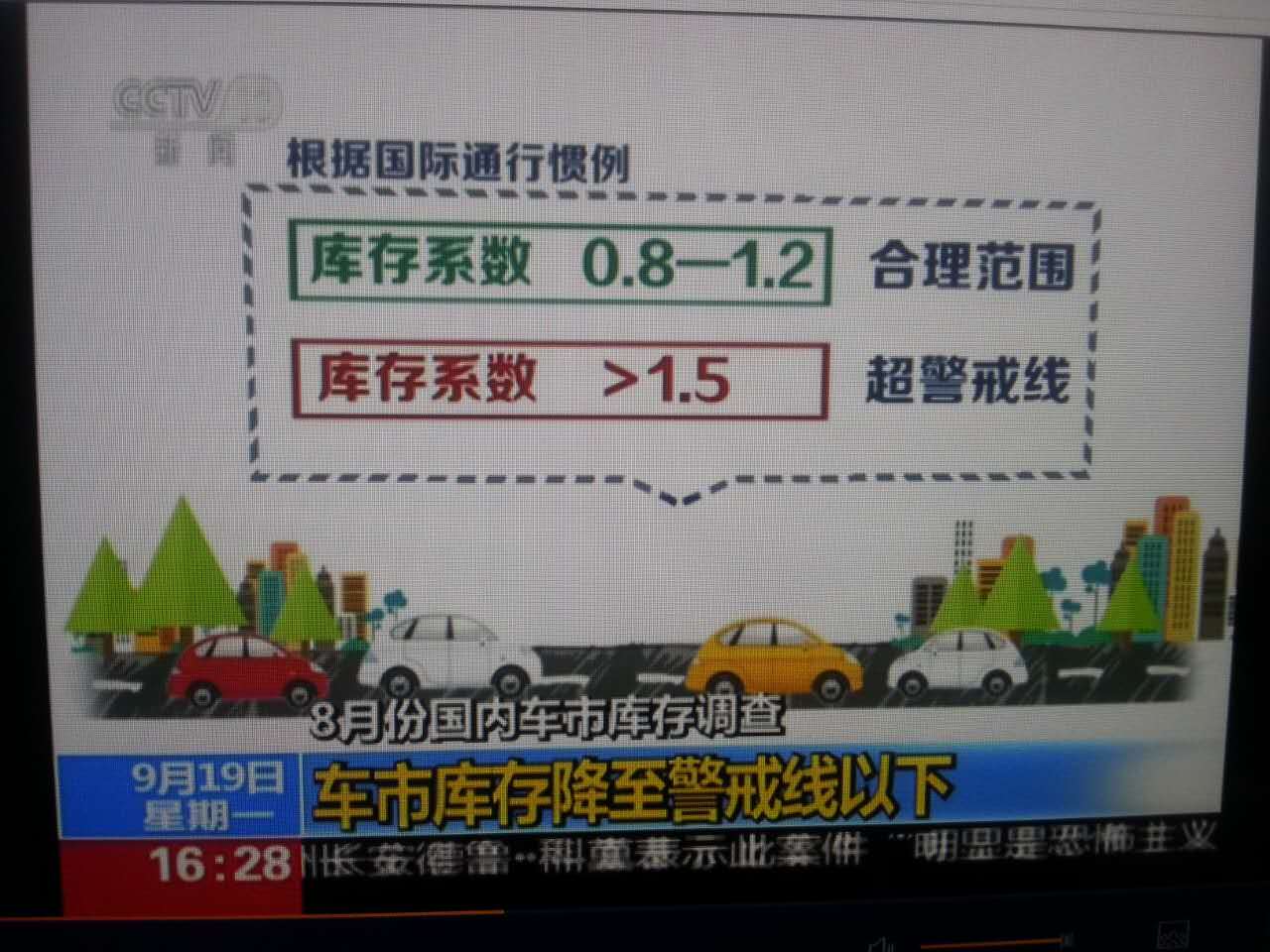 今日(9月19日),央视CCTV13新闻频道据中国汽车流通协会发布的2016年8月份“汽车经销商库存调查结果”报道,8月份汽车经销商综合库存水平回落至警戒线以下。