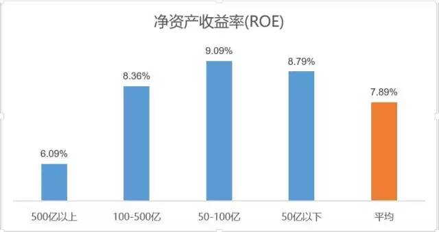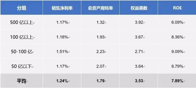 为了进一步剖析原因,我们再将净资产收益率这个指标做拆解,得到销售净利率、总资产周转率和权益乘数3个指标,来分析一下企业在销售、运营和筹资方面都处于怎样的水平。显而易见,50-100亿群组的集团在各方面发展最为均衡,权益乘数较低,发展最为稳??;而500亿以上集团资产周转效率偏低,负债水平较高。