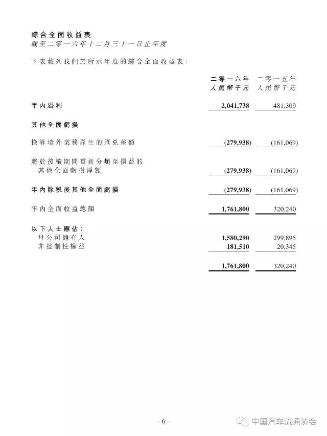 2016年度中升汽车共销售新车300753台,较上一年度同比增长23.4%;实现总收入715.9亿元人民币(货币单位下同),同比增长21.1%;企业综合毛利率达9.2%,较上年增加了1.3个百分点;实现其他增值业务收入12.8亿元,同比增长32.0%;年内实现净利润20.4亿元,同比大幅增长324.2%。