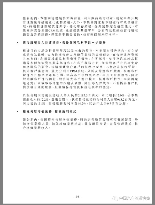 售后服务业务方面,润东汽车在报告期内,树立新车销售为载体,大力推进售后以及增值业务的经营理念。报告期内润东汽车售后服务业务收入同比增长12.0%,占总收入比重为12.2%,售后服务毛利9.7亿元,同比增长13.8%,售后服务毛利率较上年增长0.7个百分点至44.2%;同时通过完善增值业务专项发展绩效,增加增值业务人员,加强增值业务培训,丰富增值产品,完善管理体系,提升增值业务收入。