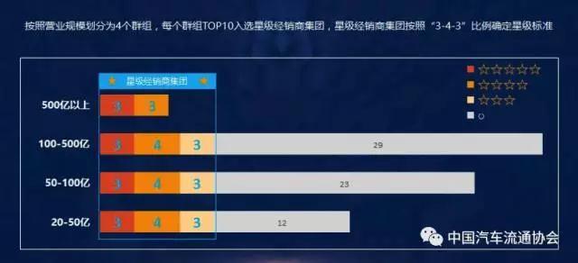 除了百强经销商集团排名之外,中国汽车流通协会按照有效规模将百强经销商集团划分为4个级别,对每个级别排名前10的集团按照综合实力进行星级评价,评选出百强综合实力排名。