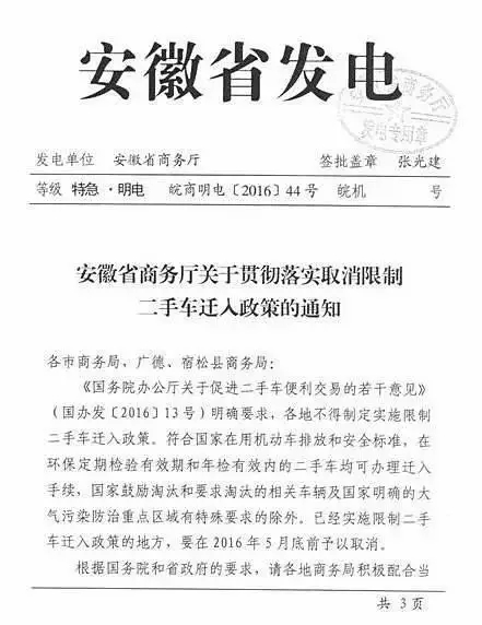 安徽省发出通知:取消限制二手车迁入政策!要求各地规范二手车交易秩序!
