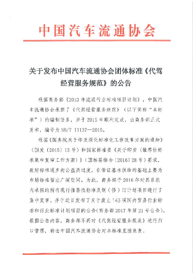 关于发布中国汽车流通协会团体标准《代驾经营服务规范》的公告