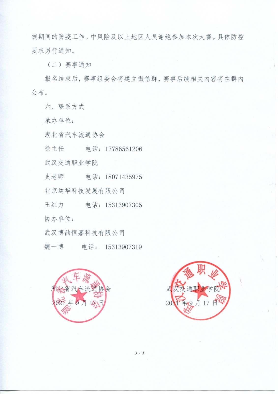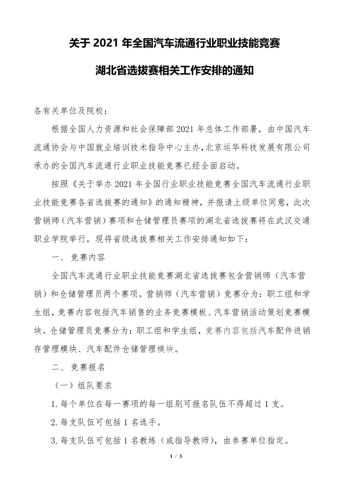 关于2021年全国汽车流通行业职业技能竞赛湖北省选拔赛相关工作安排的通知