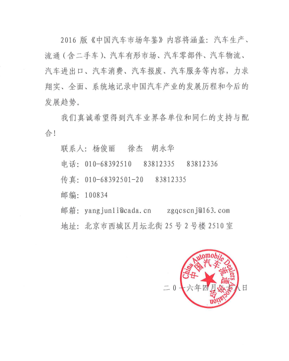 关于编撰《中国汽车市场年鉴》 (2016版)的通知