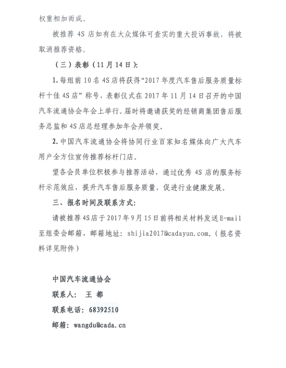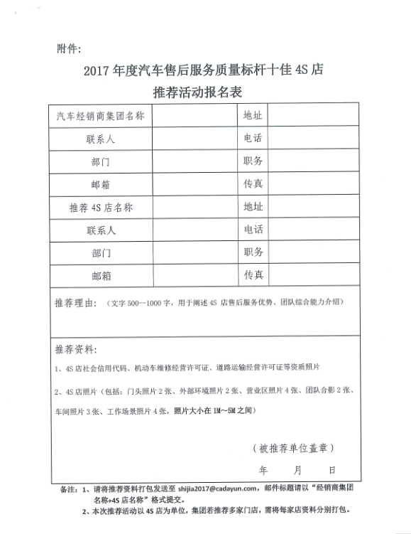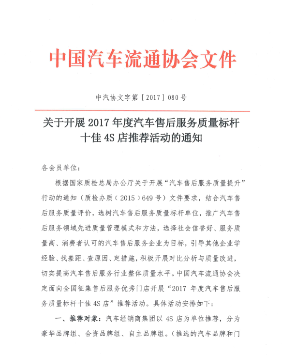 关于开展2017年度汽车售后服务质量标杆十佳4S店 推荐活动的通知