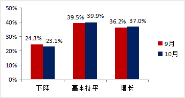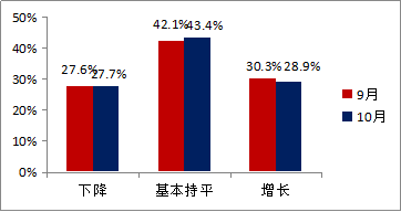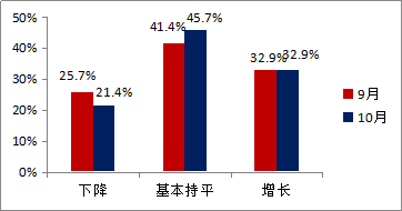 10月份,认为成交率下降比例由上月的25.7%降至21.4%,认为增长的比例与上月持平,认为基本持平的比例由41.4%升至45.7%。