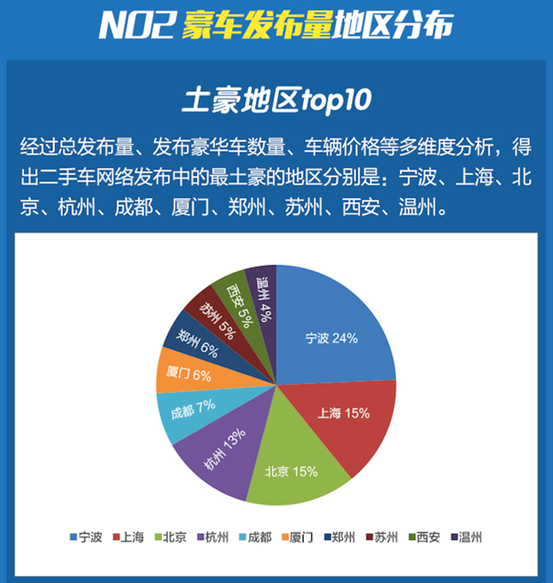 9月相比,10月豪车发布量城市前三名无变化,一直以来都是被宁波、上海、北京承包。10个城市中,绝大部分为南方城市,可见南方豪车数量相比北方城市较多。这与各地的经济水平有直接关系。