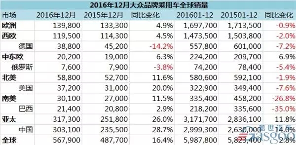 2016年,大众品牌乘用车全球销量较2015年销量增长2.8%,全年交付销量达599万辆,高出2015年164,000辆。其中,2016年12月全球销量劲增16.4%,达567,900辆。