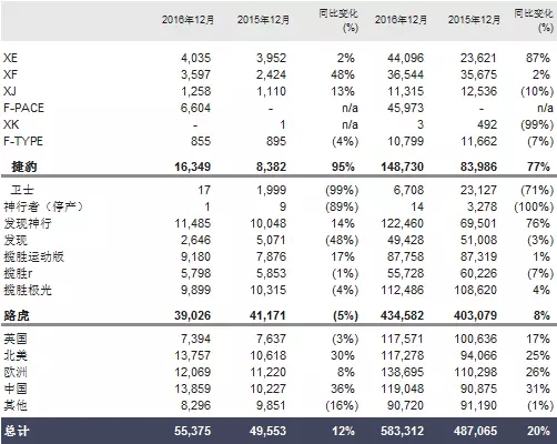 2016年12月份,捷豹路虎全球零售销量为55,375辆,较2015年同期的49,553辆,同比上涨12%;2016年捷豹路虎全球累计零售销量为583,312辆,2015年同期为487,065辆,同比攀升20%。