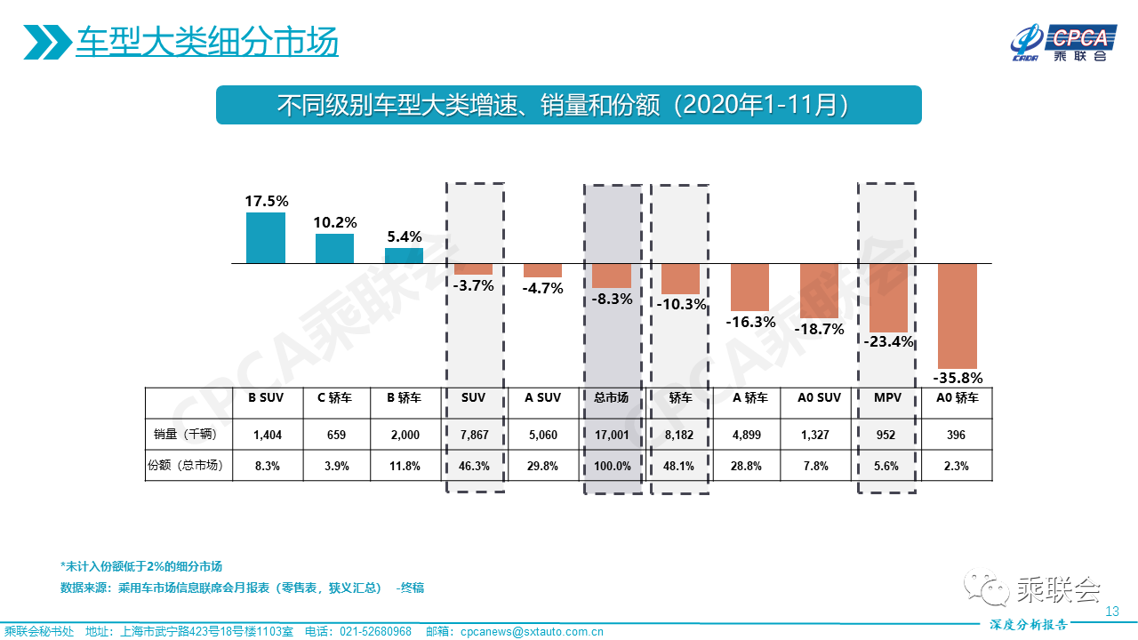 • 不同级别车型大类增速、销量和份额——2020年11月及累计