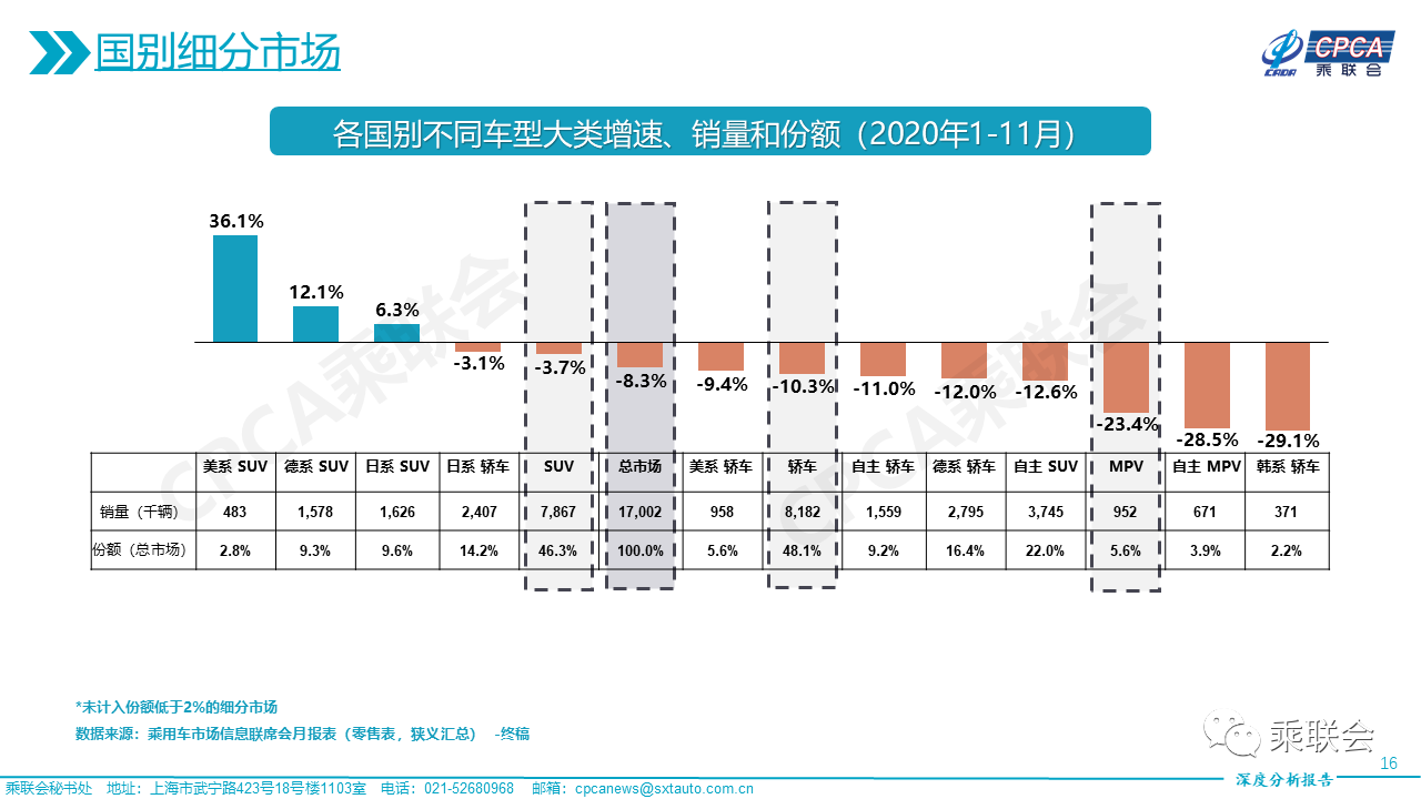 • 各国别不同车型大类增速、销量和份额——2020年11月及累计