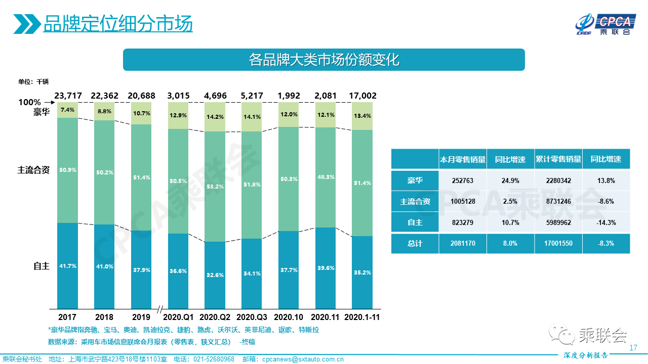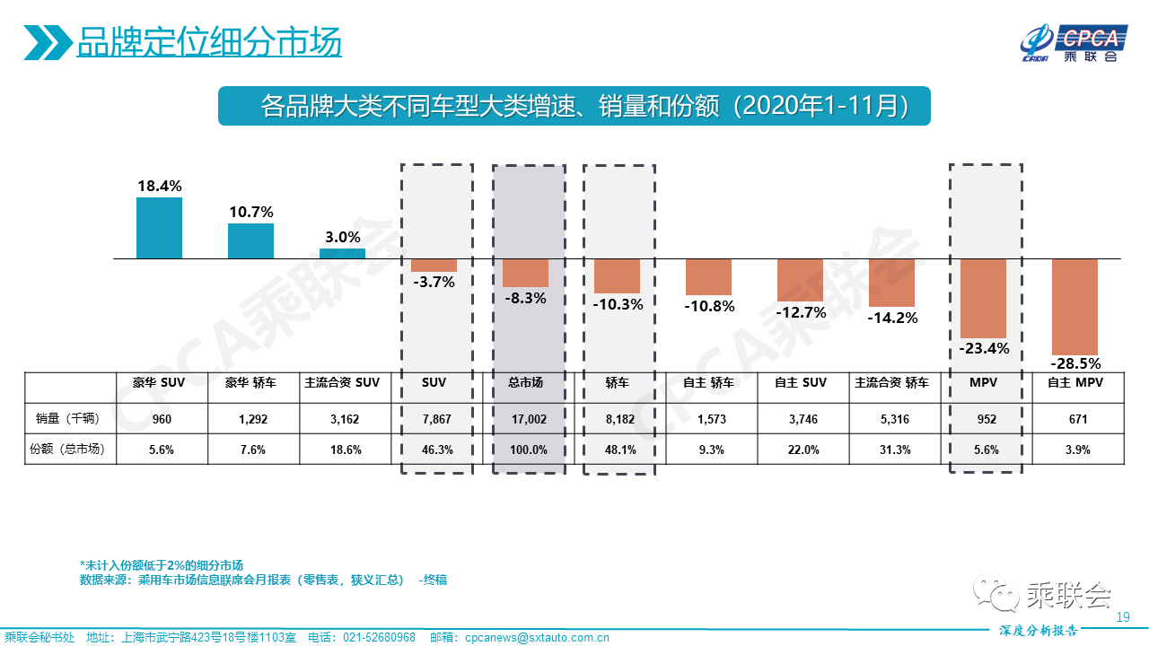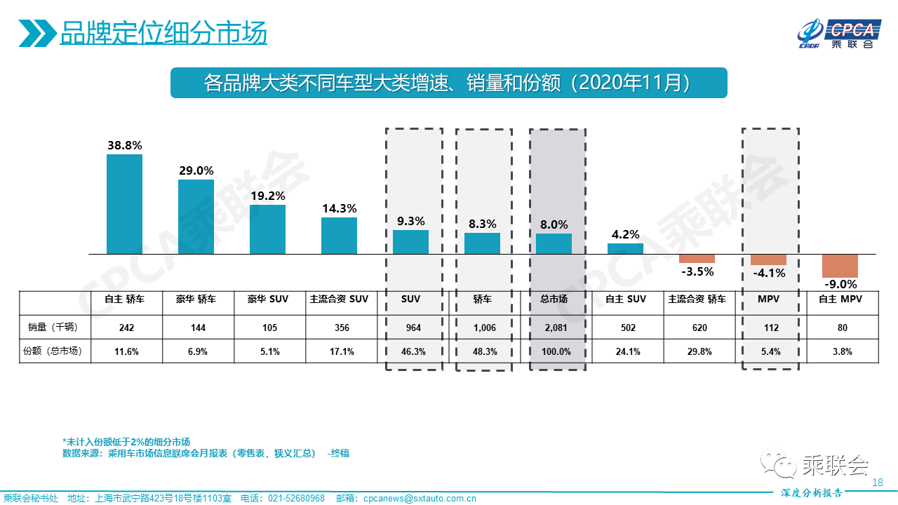 • 各品牌大类下不同车型大类增速、销量和份额——2020年11月及累计